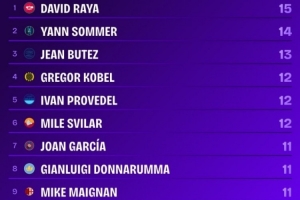 排在他身后的是国米门将索默,有14场零封。巴萨门将霍安·加西亚、曼城门将多纳鲁马、米兰门将迈尼昂和皇马门将库尔图瓦都是11场零封。