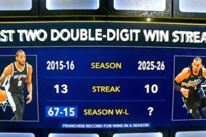 马刺上一次至少10连胜是2015-16赛季,他们曾豪取13连胜,常规赛战绩是队史最佳的67胜15负。今日过后,马刺战绩来到了42胜16负。