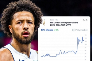 体育资讯2月25日讯 体育预测平台Polymarket数据显示,坎宁安他的MVP概率在过去一周里已经翻了4倍,来到13%概率。