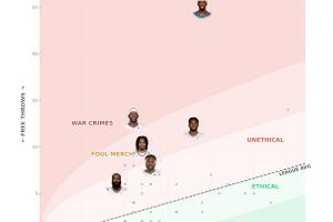 Unethical Hoops的“无德”指数主要依靠罚球数量vs出手数的比值来进行计算,数值越大,越是“没有道德”;