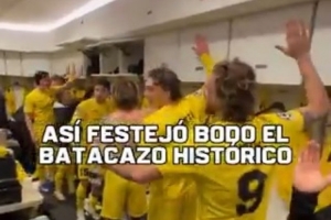 博德闪耀教练和球员赛后在更衣室庆祝晋级,他们拍打桌子和更衣柜,以特有的方式庆祝,更衣室内气氛热烈。